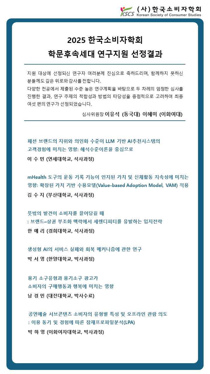 2025 한국소비자학회 학문후속세대 연구지원 선정(김수지 선생님, 지도교수: 권영범교수님)