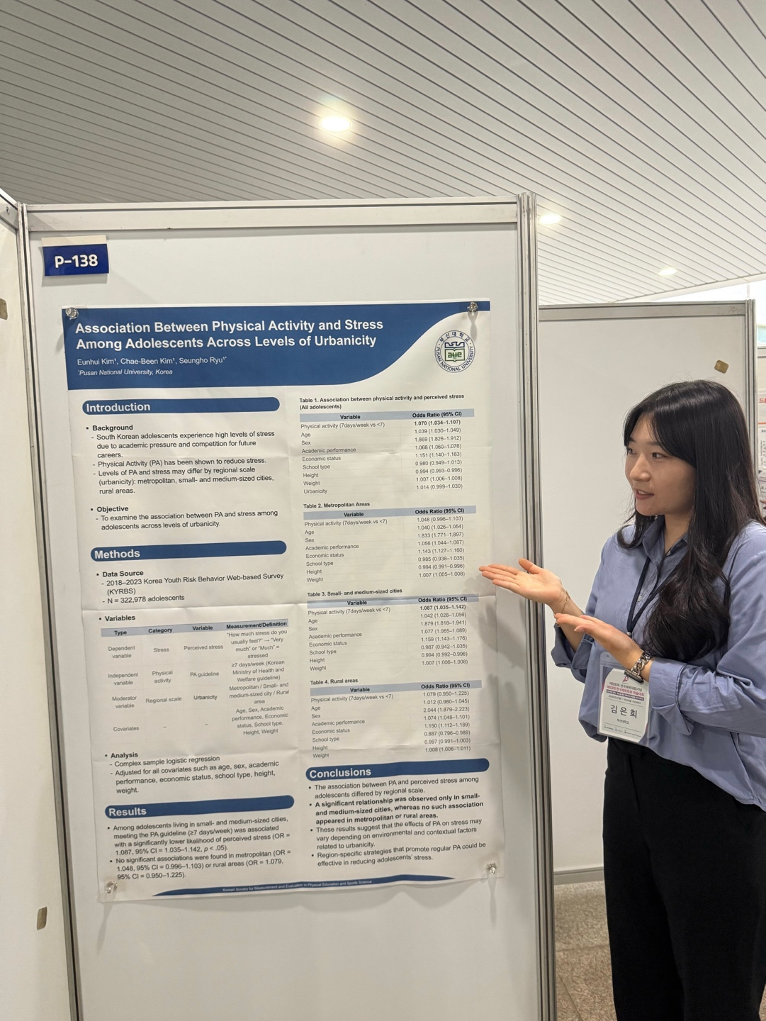 10/17(금)~18(토) 양일간 개최된 제 106회 전국체육대회기념, 제63회 한국체육학회 학술대회에 스포츠의학연구실 김채빈선생님, 스포츠데이터분석 및 건강증진 연구실의 김은희선생님, 스포츠경영/건강경영연구실의 최민서 선생님께서 포스터 발표 진행하였습니다.